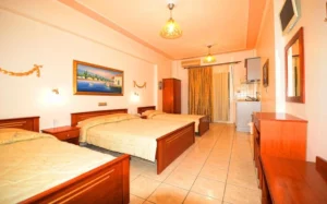 Hotel Kouros — невеликий пляжний готель, що розташований а узбережжі міста Пієрії. Мала кількість номерів робить готель тихим, затишним і менш «масовим», ніж великі готельні комплекси. В будівлі наявні ліфт, стійка рецепції, а також бар/кафе — у ньому можна взяти напої, охолоджені страви або інші снеки.Кожен номер оснащений кондиціонером, власною ванною кімнатою, телевізором, холодильником та просторим балконом — зоною відпочинку поза номером, де можна посидіти на свіжому повітрі.