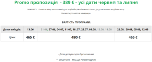 Дата виїзду: 13.06, 21.06, 27.06, 04.07, 11.07, 18.07, 25.07, 01.08, 22.08, 29.08